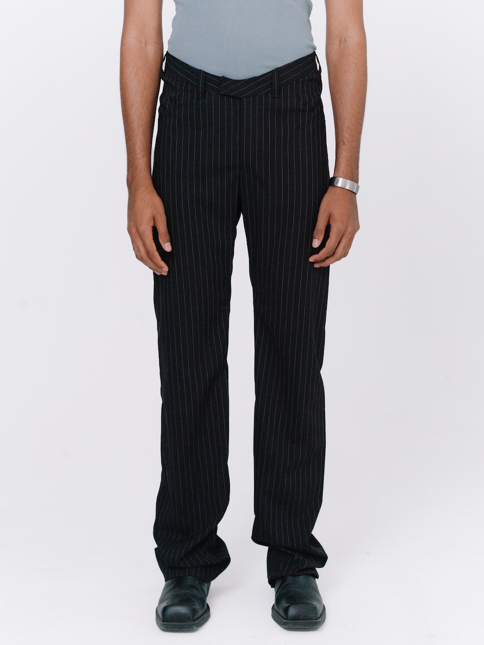 Tailored trousers in signature pinstripe fabric, featuring a distinctive V-shaped waistband and a flattering bootcut leg.