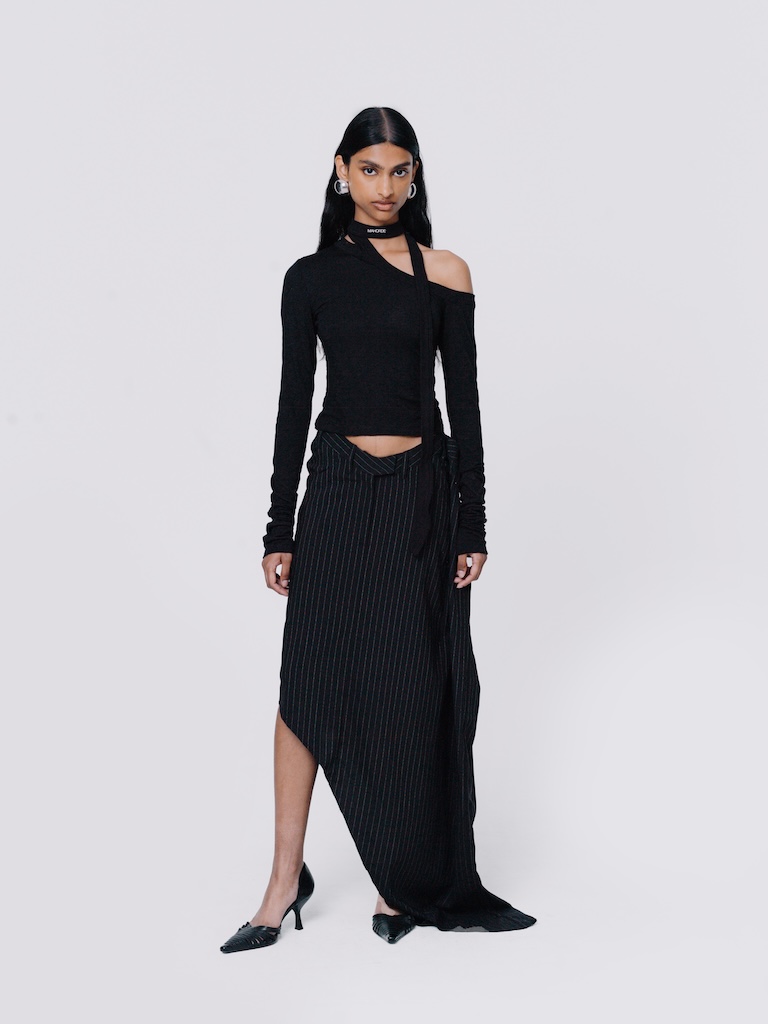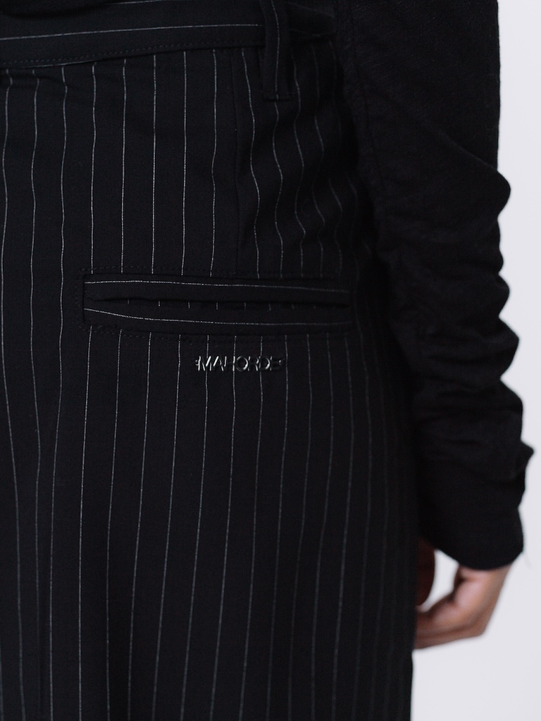 This pinstripe midi skirt features an asymmetric silhouette with an extended train . Designed with a front zip closure and two hook-and-bar fastenings at the waist belt.