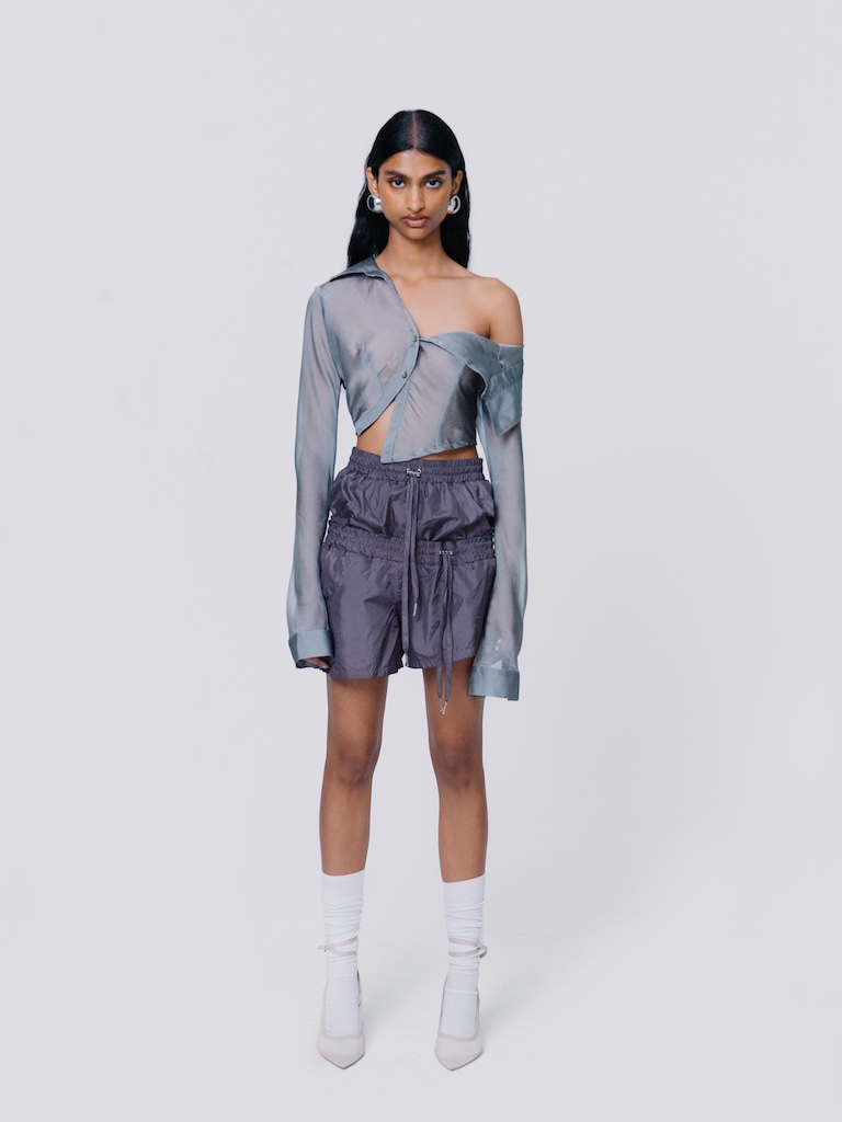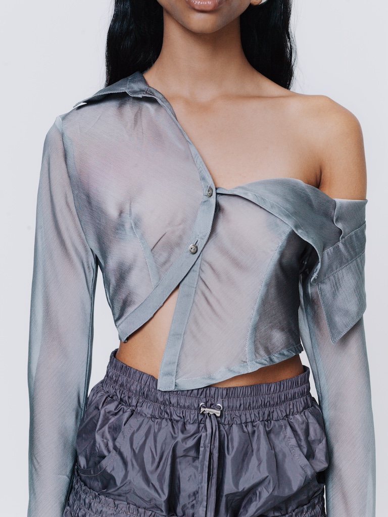 Fitted, bias-cut shirt with an asymmetric collar. Features a metal Mahorde label at the cuff of the sleeve. Crafted from sheer fabric with no stretch.